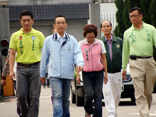 陈水扁最快2日移监,陈水扁儿子陈致中(左2)2日上午前往台北看守所探视后表示,虽然不知道何时移监,但陈水扁的心情很平静。 图片来源:“中央社”