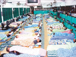 台北监狱多年来人满为患,至今仍超收40%的犯人,白天工作的厂房晚上就成了通铺房舍。图为三年前情景。图片来源:台湾《联合报》