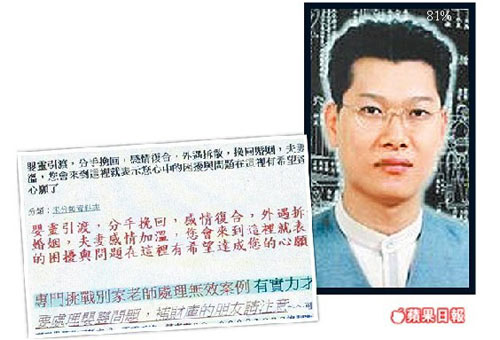 中新网12月3日电 据台湾《苹果日报》报道,台北县命理师蔡东枫声称可以化解婴灵厄运。2009年4月一对母女找蔡姓男子算命,蔡姓男子宣称31岁未婚的女儿有婴灵缠身,需要烧符作法解厄运,甚至得要男女性交,才能获得化解。
