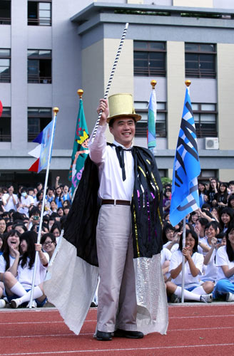 台北市长郝龙斌4日出席中山女高113周年校庆,变身花博魔术师,与师生同乐。 图片来源:“中央社”