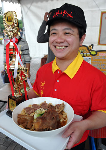 台北国际牛肉面节牛肉面评比5日出炉,“洪师父面食栈”的“唯吾独尊”获红烧牛肉面类第1名。图为领奖的师傅王聪文与得奖牛肉面。 图片来源:“中央社”