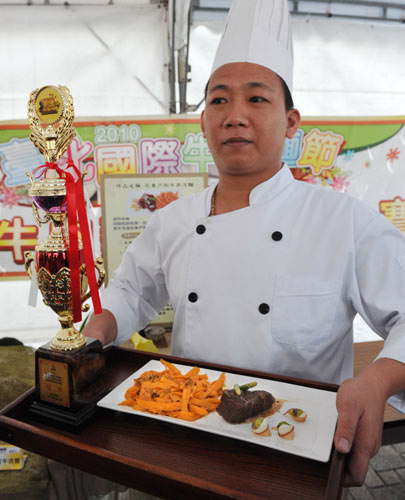 台北国际牛肉面节牛肉面评比5日出炉,凤山汤味小吃店的“花香刀削牛肉凉面”获创意牛肉面类第 1名。图为领奖的师傅李宏亮与得奖牛肉面。图片来源:“中央社”