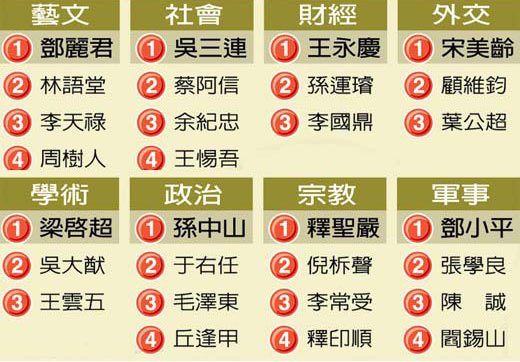 据台湾“中时电子报”报道,台湾“国史馆”举办“辛亥革命百大人物”票选活动,分政治、财经、军事、外交、社会、宗教、学术和艺文8大类。其中军事类有5名候选人供评选,分别为李宗仁、张学良、陈诚、阎锡山以及邓小平,且邓小平票数暂为军事类第1名。
