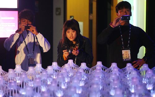 台北花博9日安排选手们参观梦想馆,网球铜牌李欣翰(右起)、空手道银牌黄钰淇、滑轮溜冰金牌宋青阳在“花械花开”表演前拍摄壮观的机械花朵。图片来源:台湾“中央社”
