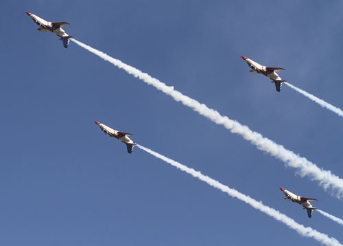 9日在台空军新竹基地举行2010年度营区开放活动,现场进行各项战机特技操演及编队冲场。图为“雷虎小组”在空中进行特技操演。 图片来源:“中央社”