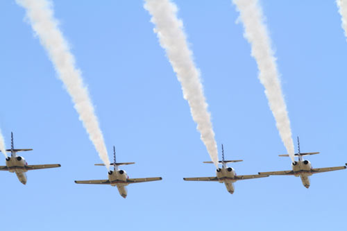 9日在台空军新竹基地举行2010年度营区开放活动,现场进行各项战机特技操演及编队冲场。图为“雷虎小组”在空中进行特技操演。 图片来源:“中央社”