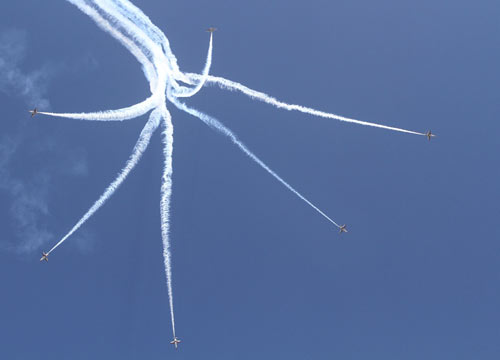 9日在台空军新竹基地举行2010年度营区开放活动,现场进行各项战机特技操演及编队冲场。图为“雷虎小组”在空中进行特技操演。图片来源:“中央社”