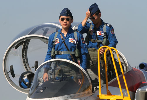 9日在台空军新竹基地举行2010年度营区开放活动,现场进行各项战机特技操演及编队冲场。图为“雷虎小组”飞官完成操演任务。 图片来源:“中央社”