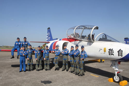 9日在台空军新竹基地举行2010年度营区开放活动,现场进行各项战机特技操演及编队冲场。图为进行特技操演的“雷虎小组”飞行军官。 图片来源:“中央社”