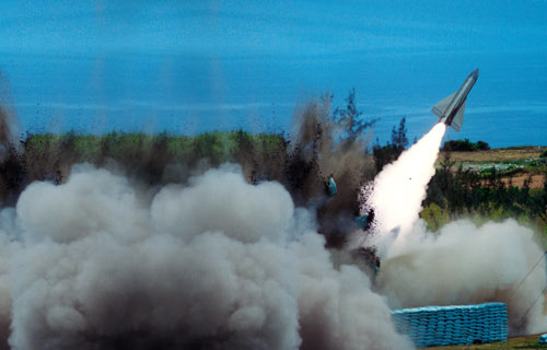 中新网12月10日电 据台湾《中时电子报》报道,台军于本周在屏东九鹏基地举行大规模联合防空飞弹实弹操演,台湾防空主力天弓一、二型及鹰式导弹,都将上场实测,美军评估小组也全程参与观察。第一阶段试射过程中,有海军陆战队发射的刺针导弹脱靶,初步研判是靶机热源不足。