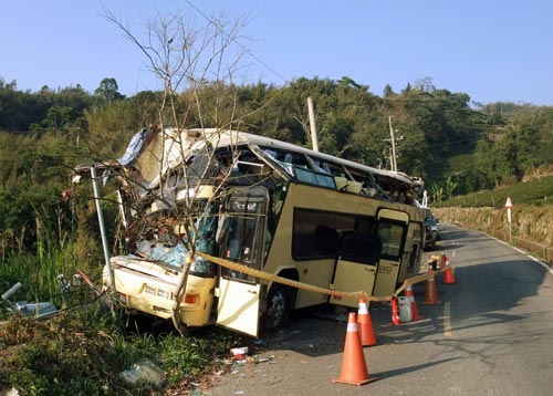 嘉义县消防局凤凰志工及眷属共有500多人参加阿里山自强活动,其中1辆游览车行经嘉156线达邦公路时,疑似刹车失灵,先擦撞山壁、接着右前方撞及电线杆后停住,整辆车倾斜在路边,差一点就坠落山谷,车上40人,有30人受伤送医,其中3人死亡、8人重伤。