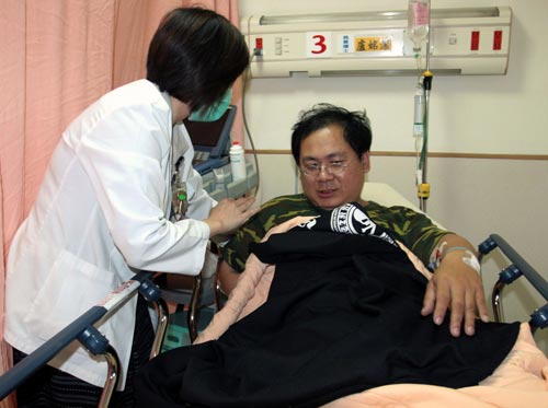 肇事的游览车司机卢敏男(右),在经检方复讯后,以新台币60万元交保。图为卢敏男就医情形。“中央社”图