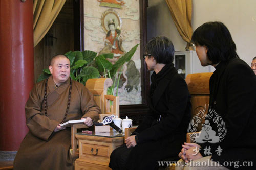 在方丈室,记者们就少林寺在传播少林文化、慈善活动、恢复少林药局及少林寺禅堂等问题,与释永信方丈进行了友好地访谈。
