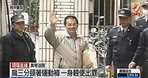 陈水扁手上拿着黄色牛皮纸袋装的卷宗,露出微笑并向在场媒体挥手致意,在戒护人员陪同下快速步入高院。