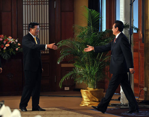 第6次两岸两会领导人商谈21日在台北圆山饭店举行,海峡交流基金会董事长江丙坤(左)在会场迎接海峡两岸关系协会会长陈云林(右)。 图片来源:“中央社”