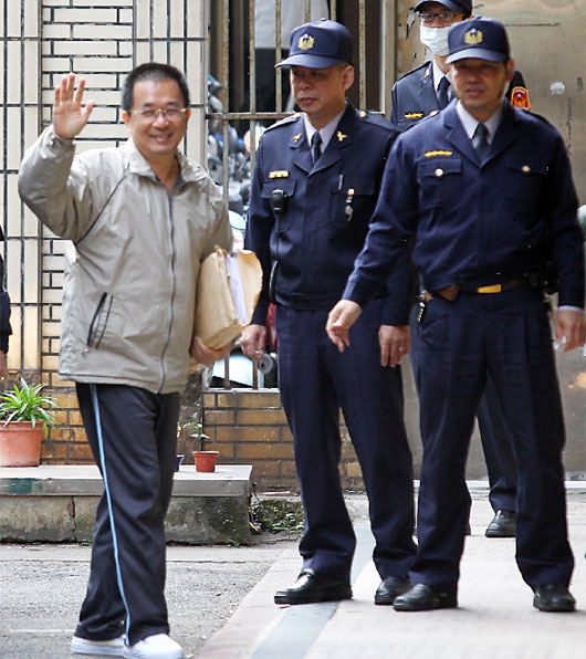 据报道,没了卸任“总统”礼遇的陈水扁,与其它被告共同搭乘囚车出庭,当扁步下囚车时,还心情不错的向拍照的媒体挥手。