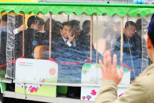 大陆海峡两岸关系协会会长陈云林(后中)夫妇22日搭乘游园专车参观台北花博大佳园区,陈云林隔着透明塑胶布,与热情游客互相挥手致意。 图片来源:“中央社”