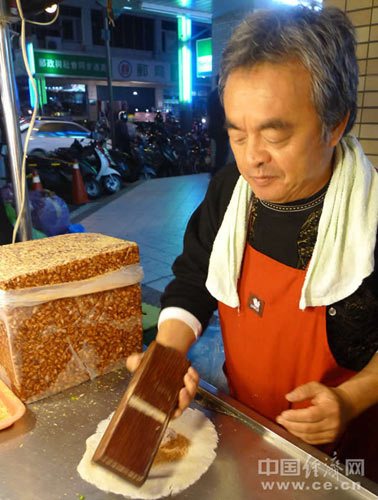 宜兰传统的花生卷冰淇淋,老爷爷从花生糖砖上磨下花生末,倒在薄饼上,然后放上冰淇淋球,口味香甜清爽。