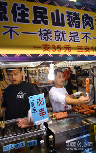 台湾宜兰罗东夜市,原住民烤山猪肉串和三星葱肉串。