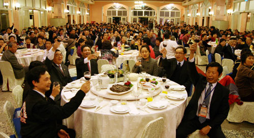 由国旅集团组成的千人陆客团,29日抵达苗栗县进行晚宴,团员一同举杯,准备迎接在台的倒数跨年夜。 图片来源:“中央社”