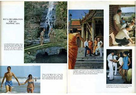 杂志上介绍说:“特别假”计划始于越南战争。在两年以前,飞赴香港或曼谷渡假的美军,每月仅有五百人,到了12月,飞离越南非军事区阴冷的雨季,或泥泞的湄公河三角洲地区,前往许多美丽都市狂欢五天的美军约达三万人。这些都市现在包括檀香山、东京、台北、新加坡、马尼拉、槟榔屿、吉隆坡,最近又加上雪梨。这个计划也许仅有世界最富有的国家负担得起。美国政府每年要付给泛美航空公司二千三百五十万美元,泛美每月开往檀香山一地的喷射专机现达四十五次,去曼谷的DC-6客机每月65次。根据许多美国士兵的意见,再没有比这笔钱用得更值得的了。