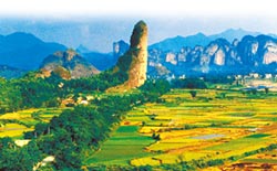 位于江西省鹰潭市西南20公里处贵溪市境内。仙女岩坐南朝北,高数十丈,两边张开相互对称,中间长有青草,线纹清晰,风姿绰约,裸露在大自然的怀抱中。金枪峰由紫红色砂岩经千万年变化,周围岩石水流冲蚀、崩塌后,形成方山石柱,留下孤独山峰,高达70米。金枪峰与仙女岩遥相呼应,数千年来被民众视为阴阳象征物,顶礼膜拜。