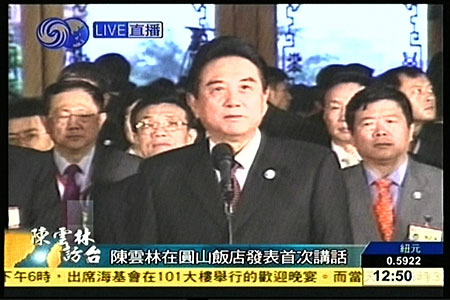 陈云林指出,这次两会商谈,任务非常明确,也非常单纯,都是有利于两岸同胞的好事情,不会涉及两岸的政治问题,更不会涉及岛内的任何政治议题。
