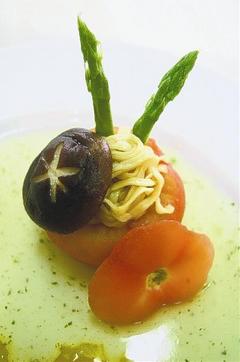 明新科技大学学生江慧君、屏东科技大学学生陈靖瑜,事先以MSN讨论出五套菜单,最后以“茄汁面盅”参赛。江慧君说,他们先用热水烫过西红柿、芦笋,再把泡面丢下去煮,煮出来的面有独特的蔬果香,搭配酸甜酱汁,适合夏天开胃。