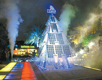 中新网12月19日电 据台湾《中国时报》报道,全台首创“太阳能科技圣诞树”,18日晚上在港都城市光廊点灯,这棵圣诞树是运用太阳能动力,启动太阳光电模块,使大片强化透光玻璃反光出现亮度,白天吸收能量,夜晚绽放爱的光芒。(杨嘉裕)