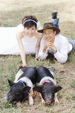 冯煜桥和太太说好拍婚纱时,就把他养的麝香猪一起入镜,就如拍宠物般,两人和一对宝贝同时完成人生大事。