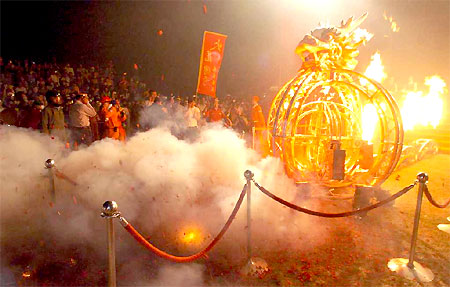 傍晚6时10分,在盐水中学操场点燃火龙,龙头冒出熊熊火焰,瞬间引燃鞭炮,启动了13公里的鞭炮阵。