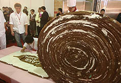中新网3月22日电 你吃过最大的蛋糕有多大?台北世贸二馆从今日(22日)起有一场蛋糕特展,其中的噱头是一个直径150公分的瑞士卷,还有6斤重的大凤梨酥,相当特别,而现场的凤梨酥辣妹,更是引来人潮聚集。