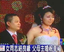 据台湾东森新闻以及TVBS报道,披上白纱的小娟,双手被爸爸紧紧握着步上红毯,亲手将女儿的一生,托付给新郎卤蛋,新郎、新娘皆为女儿身,相恋18年,在家人的见证下,完成终身大事。