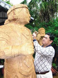 中新网4月9日电 宜兰县五峰乡花园小学校长王贤从小喜欢敲敲打打,十年前在梅花小学当主任时,碍于经费有限,校长常为选购外宾纪念品伤脑筋,便问他“你会刻木雕吗?”,他硬着头皮答应,没想到就此与木雕结下不解之缘。