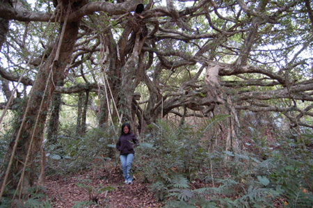 这株老榕树的母树头,必须五六个大男人双手合抱,上百根气根有的笔直地扎在地上,就像在走路般,有的像展开的双臂一样往前伸展,有的则盘旋在树幅上。整株树占地五六百坪(一坪=3.30378 平方米),气势宏伟,这是目前发现最大最为壮观的榕树。