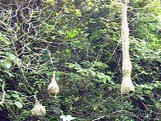 生态农场副主任郭明忠说,“这种建筑方式就能躲过大嘴鸟掠食它的鸟蛋或是幼鸟。”看来现在每天都在附近虎视眈眈的大嘴鸟,就算嘴再长,恐怕也吃不到这家织布鸟的鸟蛋了。