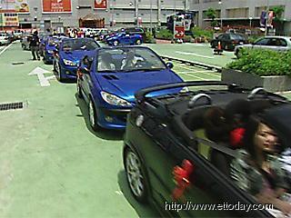 红的、蓝的、银的,一台接着一台,这帅气敞篷车队一上街,立刻成了民众注目焦点,不过,这个车队有点长,还造成大塞车,一个不小心有车脱队了。赶快跟上,终于这长长车队顺利抵达饭店,新郎倌松了口气。