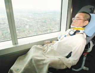 中新网6月25日电 搭台北101大楼的快速恒压电梯,37秒就可以抵达观景台;但对渐冻人而言这短暂片刻却是生命的挑战。来自岛内各地的23位渐冻人24日登上台北101向人宣示:“即使带着呼吸器,依然不放弃行动的自由。”