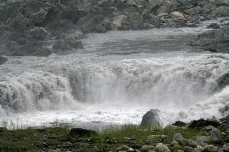 中新网7月9日电 台湾省南投县浊水溪河床最近出现新地理景观,水雕峡谷的开始处形成一道孤状瀑布,由于溪水浊黑,水花飞溅,声势惊人,故有人称做“台湾壶口瀑布”。