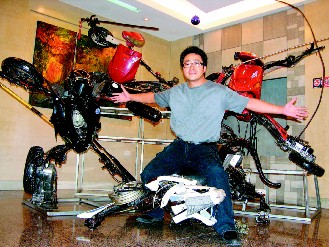 吴季轩把自己报废的摩托车转换变成时下最热门的“变形金刚”,创作大型钢雕作品。他尽量保持零件原貌,再稍加焊接或切割等过程,却让冷冰冰的机械立刻有了生命,也为郭姓商人的“神采飞扬KTV”添新风貌。