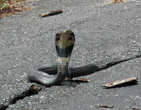 台东最近天气炎热,山区杂草枯死,蛇类少了藏身处,活动频繁。六日上午在鹿野高台茶区的马路上,出现一条眼镜蛇,开车和骑摩托的民众,见时都吓坏了。由于这条蛇刚好藏在马路正中央的裂缝内,来往车辆频繁,进退不得。