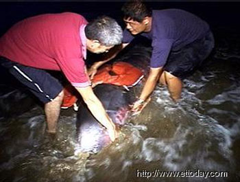 中新网8月17日电 圣帕台风还没登陆台湾,但外围环流带起的强劲风浪已经出现影响。昨天晚间有民众在台北县万里乡海岸边发现三只鲸豚,伤痕累累的搁浅在沙滩上,其中一只还是刚出生不久的小鲸豚。海巡人员分析,它们可能是被大浪打伤,因为不忍放弃同伴,所以才会集体搁浅。