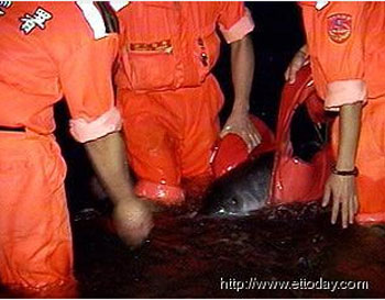 据台湾东森新闻报道,浅滩上的大鲸豚白色腹部上布满了红色伤痕,两名壮汉七手八脚正试着把它推回大海中,但受了伤的大鲸豚并不好控制,再加上海边大浪一波波打过来,鲸豚不停扭动的尾巴,差点就扫到一旁的消防人员。