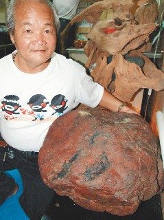 今年初,他一路往浊水溪源头找奇石,无意间发现一粒鸡血石,清开表面确认后,再拨开四周泥砂,才知道这是一粒超大的鸡血石;运回家,过磅出重达120公斤,让他非常兴奋。