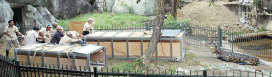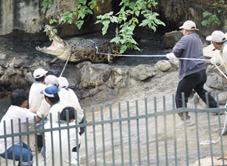 由于无人敢接近河口鳄,保育员采绳索硬拖拉法,八名保育大汉像拔河一般,将河口鳄硬拉进长铁笼内。随后又以同样模式,再硬拖重约一百三十公斤母鳄进入另一铁笼,以吊车先后安移入新居,与凯门鳄隔栏而居。