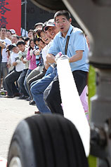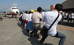 员工组则显得有备而来,穿着整齐制服,当30十名选手还拉不动时,远航董事长乐大信和总经理陈尚群也加入拔河,直到40人终于拖动飞机,多位选手大呼好玩。