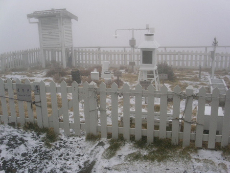 台湾最高峰玉山主峰海拔三千九百九十七米,当天上午八时三十分的气温是摄氏零下三度,到下午三时三十分,仍是零下一度。