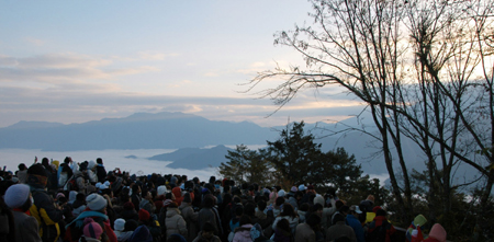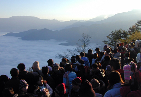 虽然寒流来袭,阿里山的最低温只有摄氏二度,但大批游客仍摸黑起大早,将祝山观日平台挤得水泄不通。