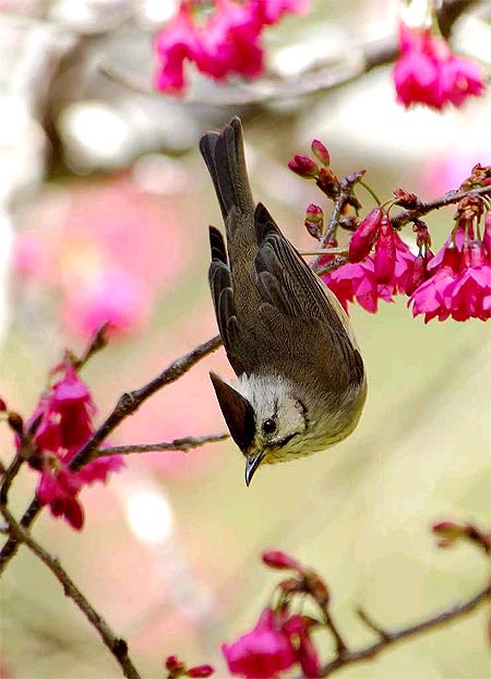 南投掠影:画眉在樱花间觅食 好似一幅年画(图)