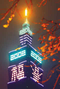 中新网2月4日电 据台湾《联合报》报道,农历新年脚步已近,台湾各地已闻到过年的气氛,台北市101大楼日前“秀”出“春”、“福”字样向市民拜年,在夜晚别有一番风味。